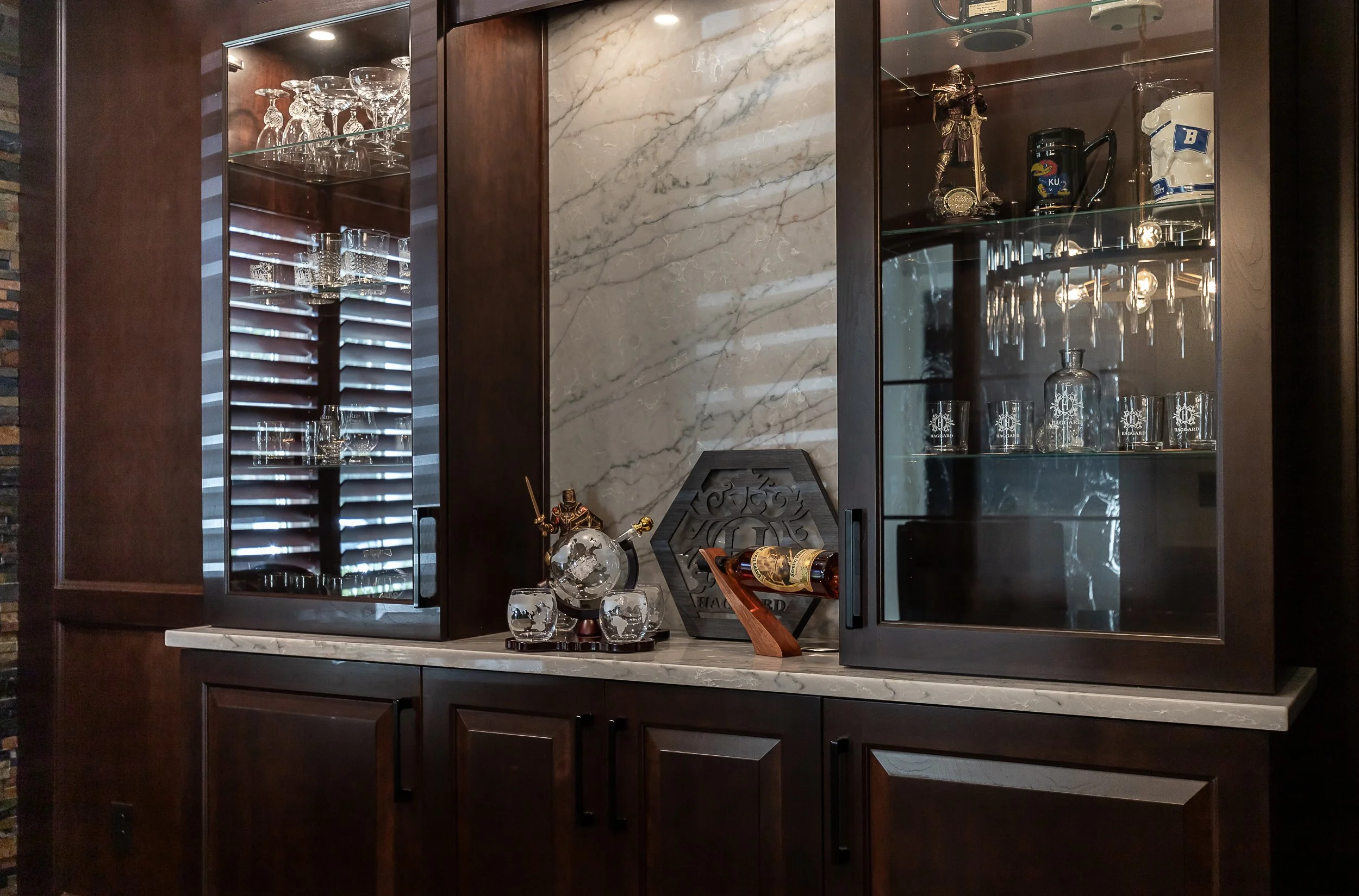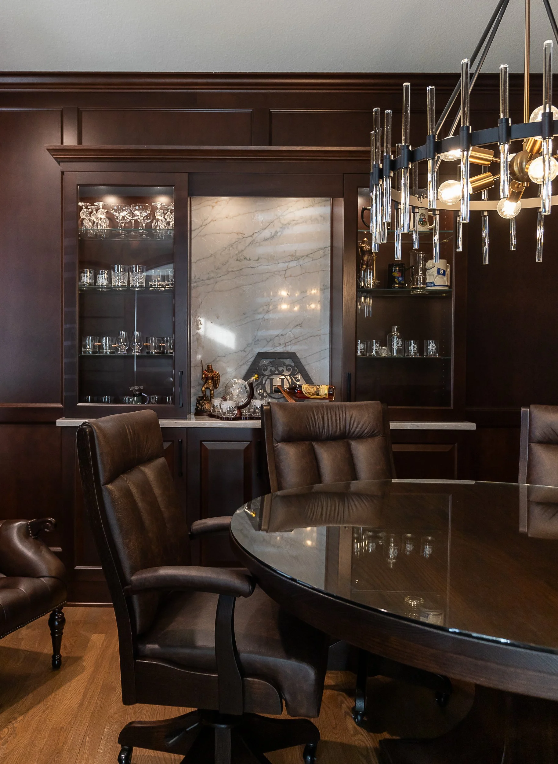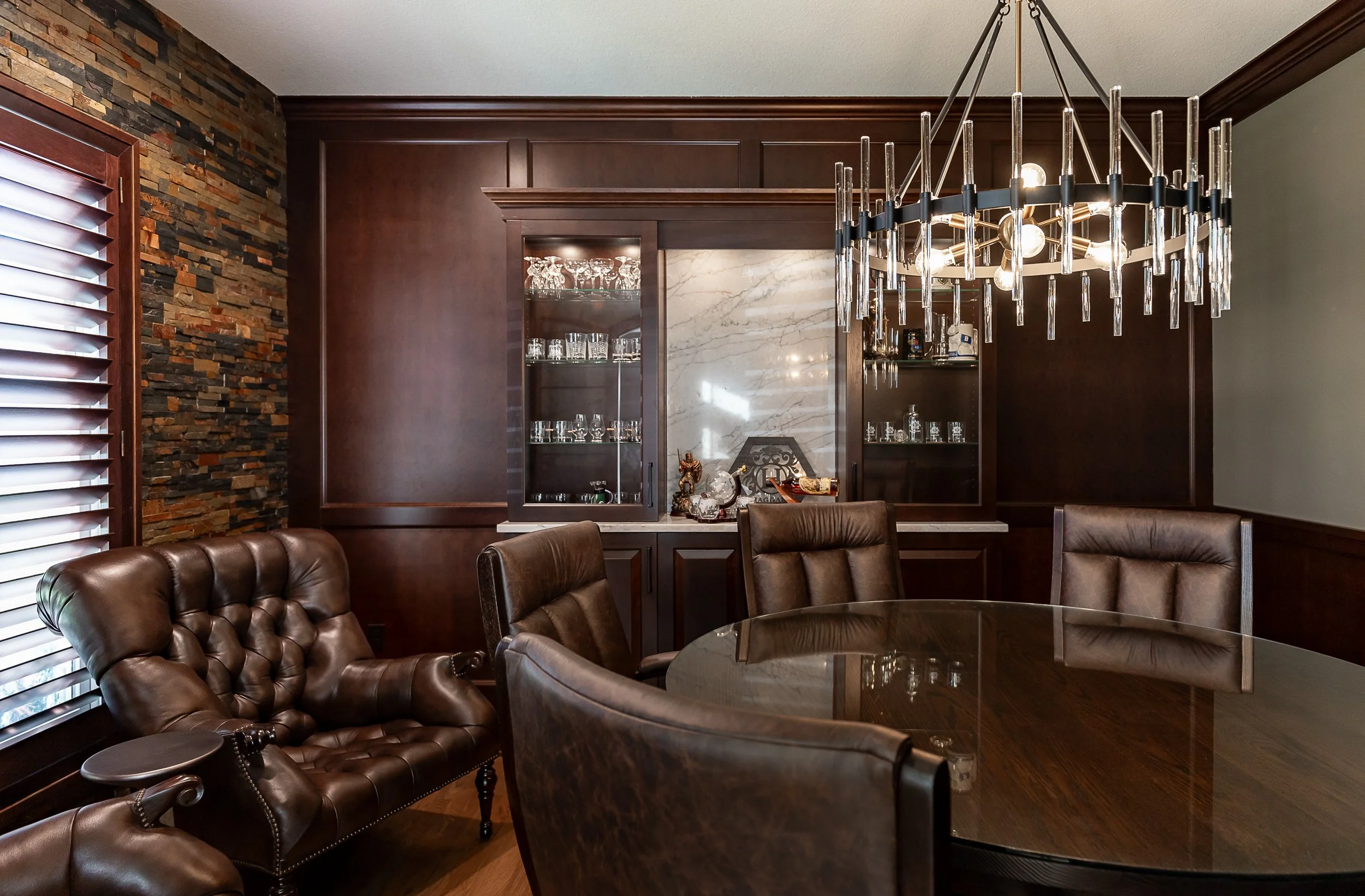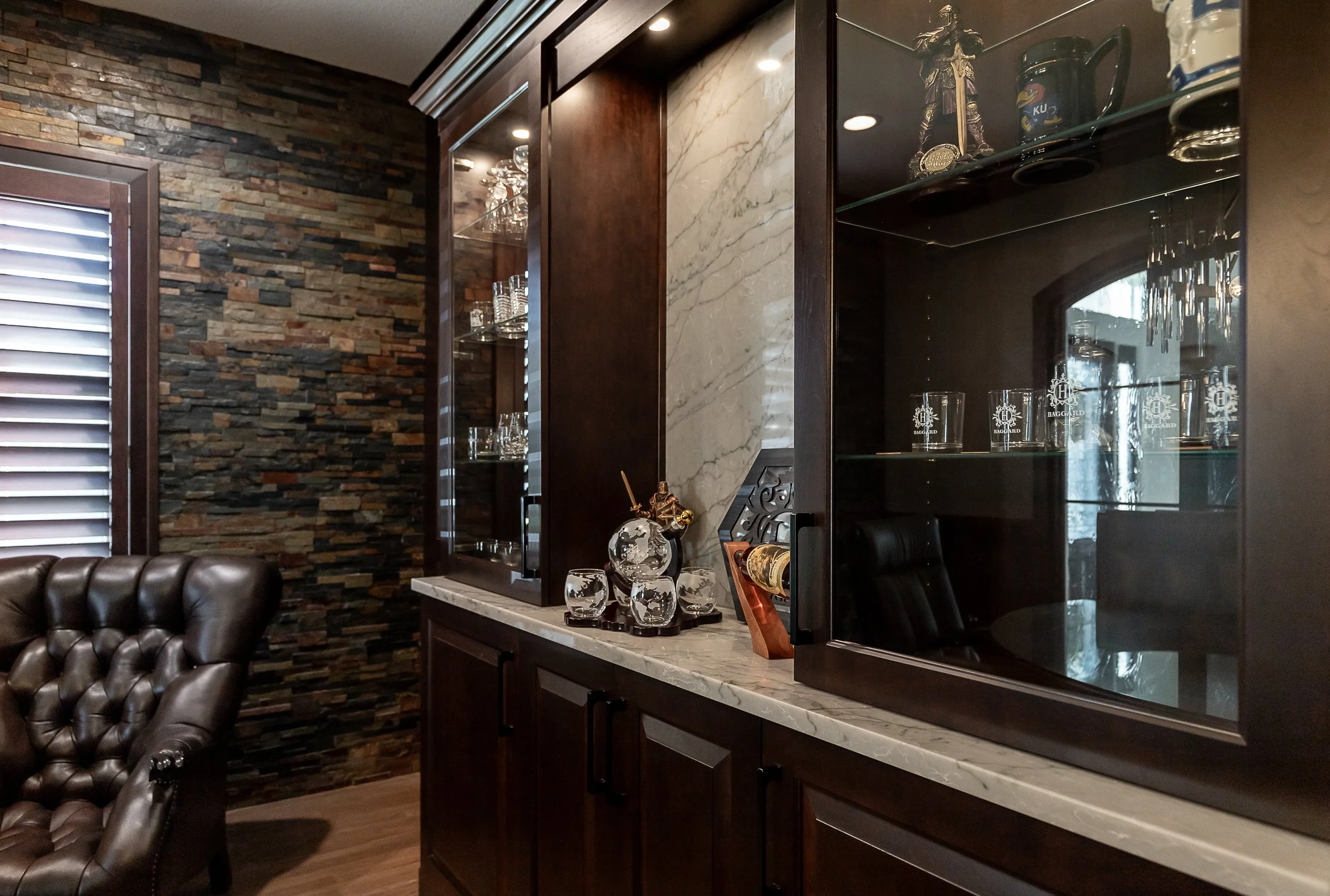 Step into the ultimate retreat for savoring fine spirits and great company. Whether you're unwinding solo, sharing deep conversations, or locked in a competitive card game, this space sets the perfect tone. Rich cherry wood wainscoting, illuminated display cabinets, and a dramatic stack-stone accent wall create a warm, inviting atmosphere. The wood flooring and sleek quartz countertop with matching backsplash complete the look—moody, masculine, and ready for memorable nights.