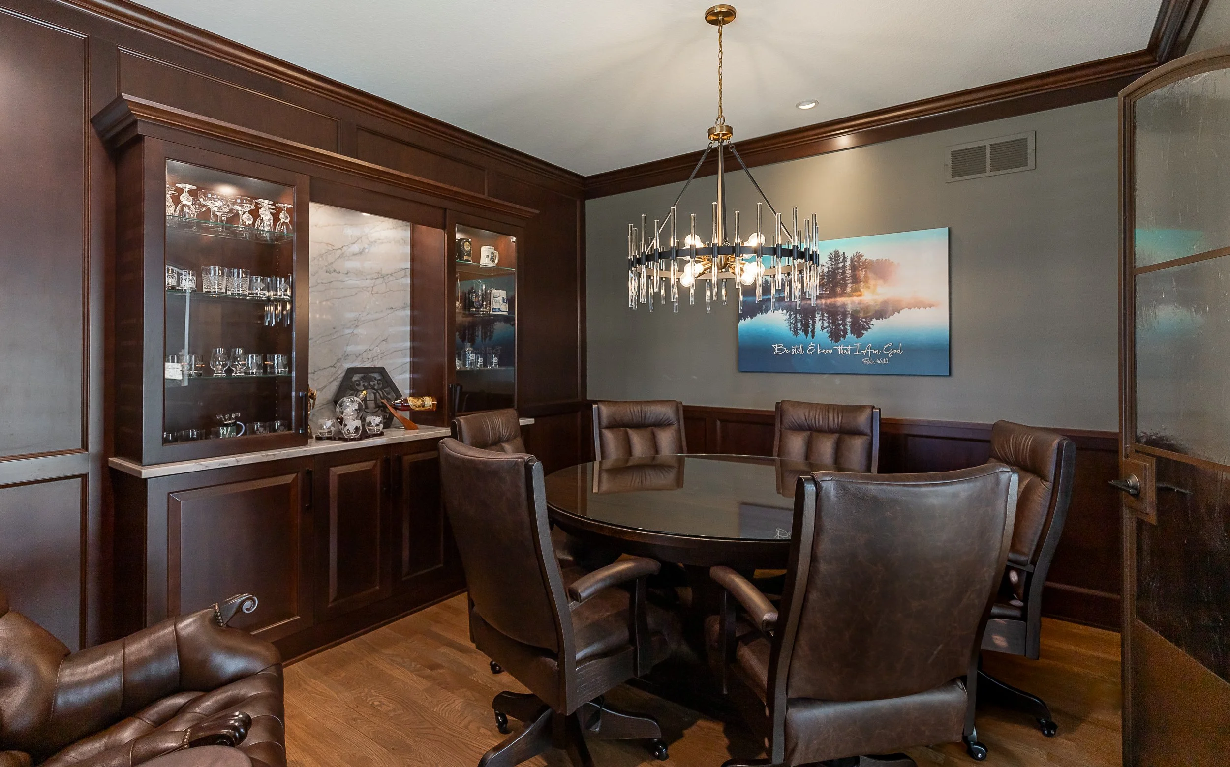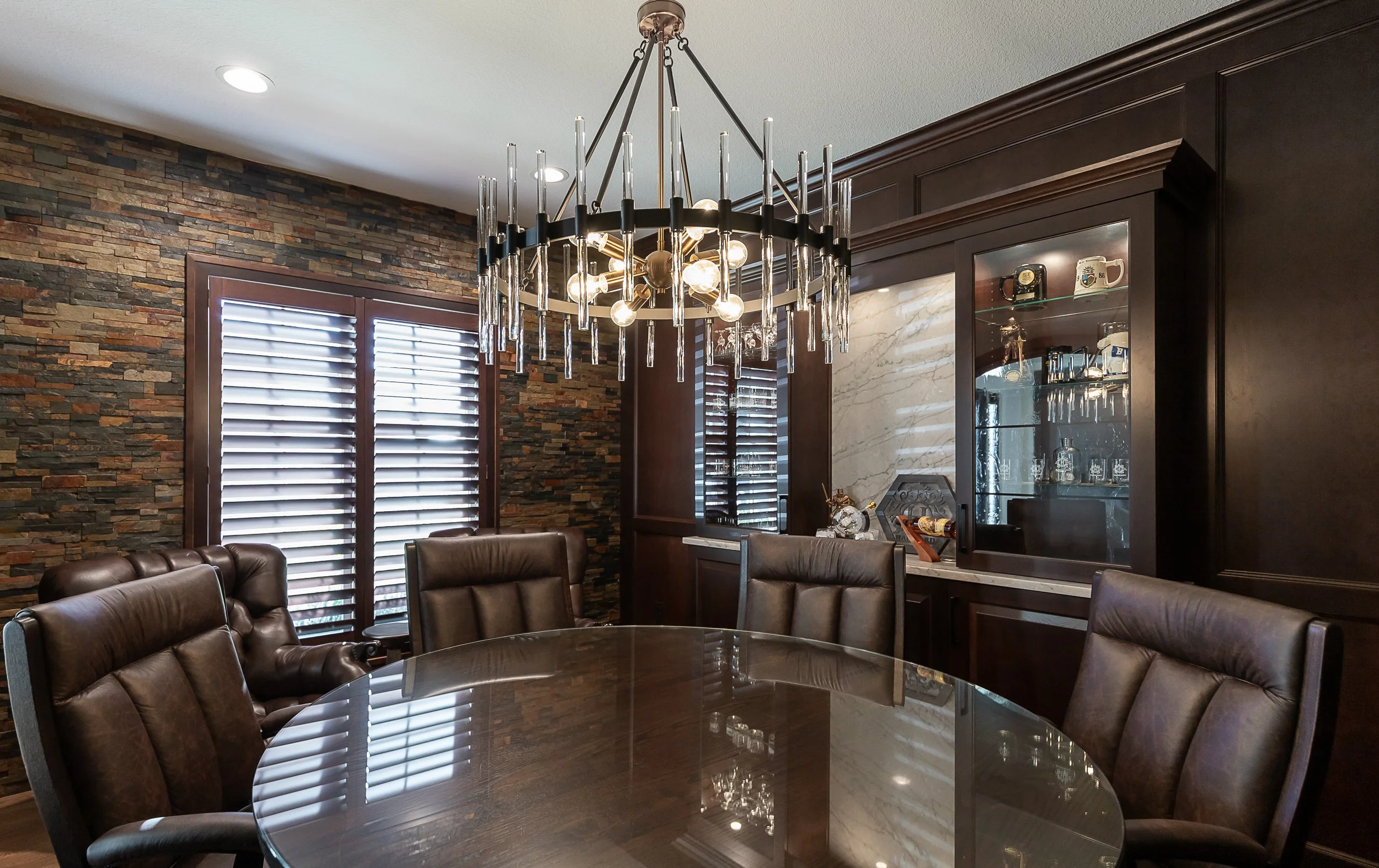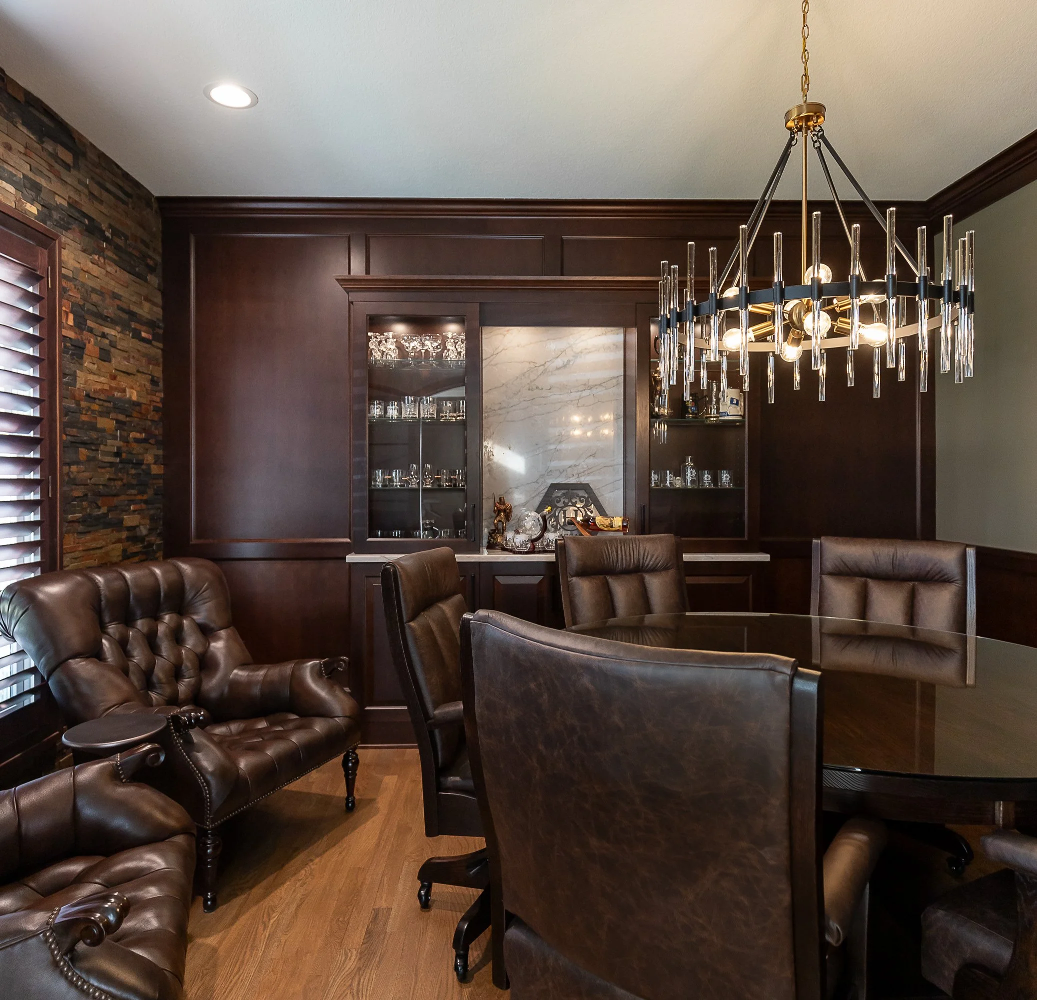 Step into the ultimate retreat for savoring fine spirits and great company. Whether you're unwinding solo, sharing deep conversations, or locked in a competitive card game, this space sets the perfect tone. Rich cherry wood wainscoting, illuminated display cabinets, and a dramatic stack-stone accent wall create a warm, inviting atmosphere. The wood flooring and sleek quartz countertop with matching backsplash complete the look—moody, masculine, and ready for memorable nights.