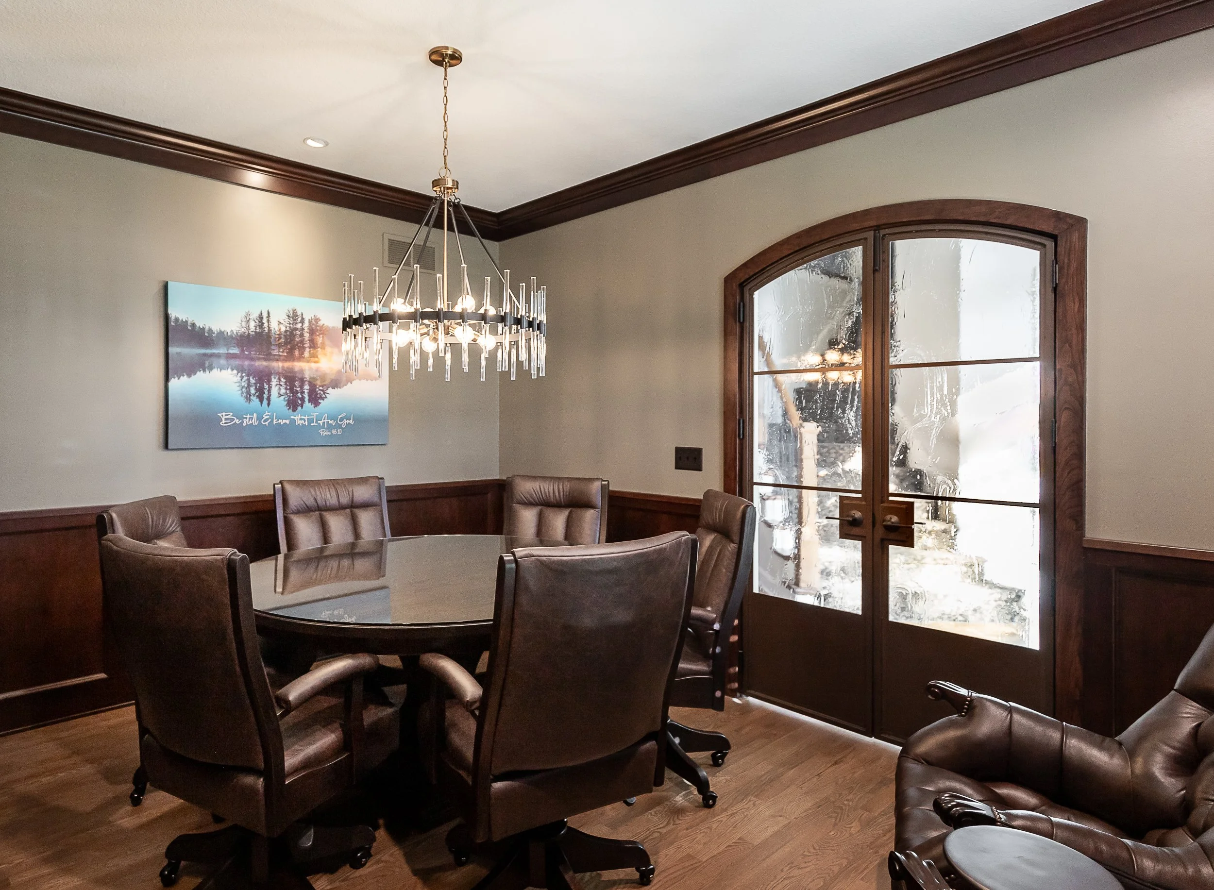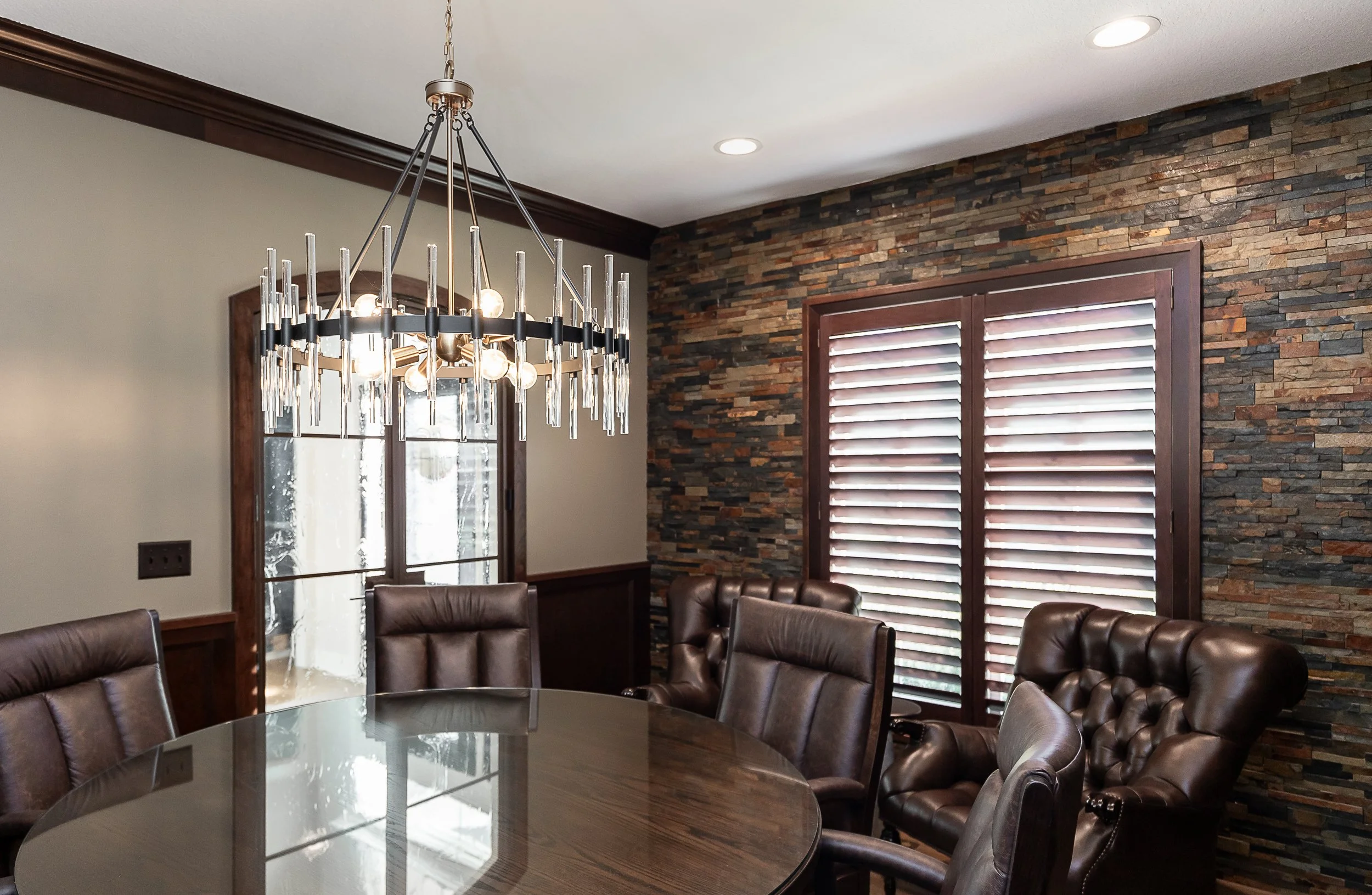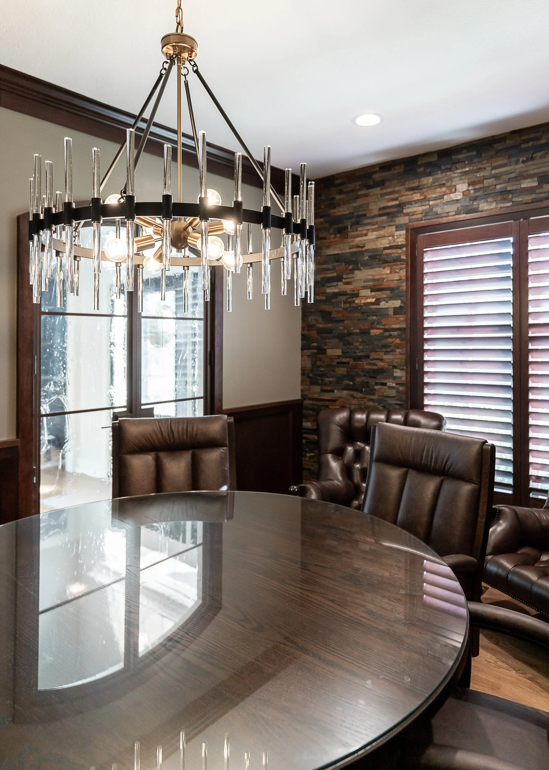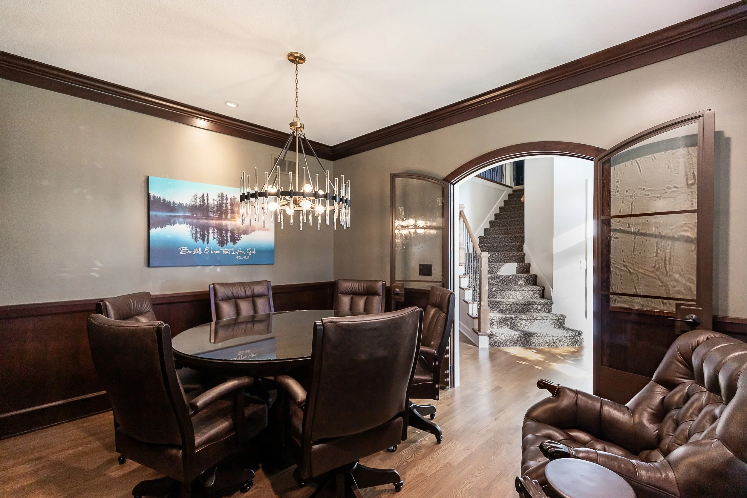 Step into the ultimate retreat for savoring fine spirits and great company. Whether you're unwinding solo, sharing deep conversations, or locked in a competitive card game, this space sets the perfect tone. Rich cherry wood wainscoting, illuminated display cabinets, and a dramatic stack-stone accent wall create a warm, inviting atmosphere. The wood flooring and sleek quartz countertop with matching backsplash complete the look—moody, masculine, and ready for memorable nights.